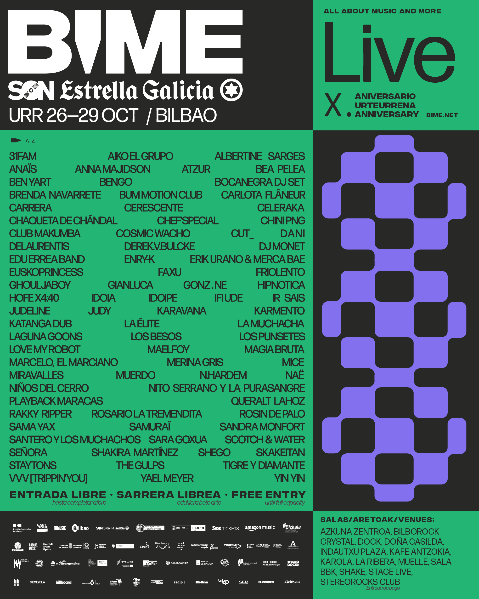 Un año más las salas de Bilbao acogerán los conciertos de BIME LIVE SON Estrella Galicia con artistas llegados de todas partes del mundo y el público de la ciudad podrá disfrutar las propuestas musicales más eclécticas y vanguardistas; con acceso libre y gratuito, hasta completar aforo. Entre las actuaciones más esperadas, llegarán La Muchacha y N.Hardem de Colombia, Los Besos de Argentina, Niños del Cerro de Chile, Maelfoy de Alemania, Chef's Special de Países Bajos, Atzur de Austria, Club Makumba de Portugal, Brenda Navarrete de Cuba y Delaurentis de Francia y destacados talentos nacionales como Merina Gris, La Élite y Sandra Monfort, entre muchos otros.